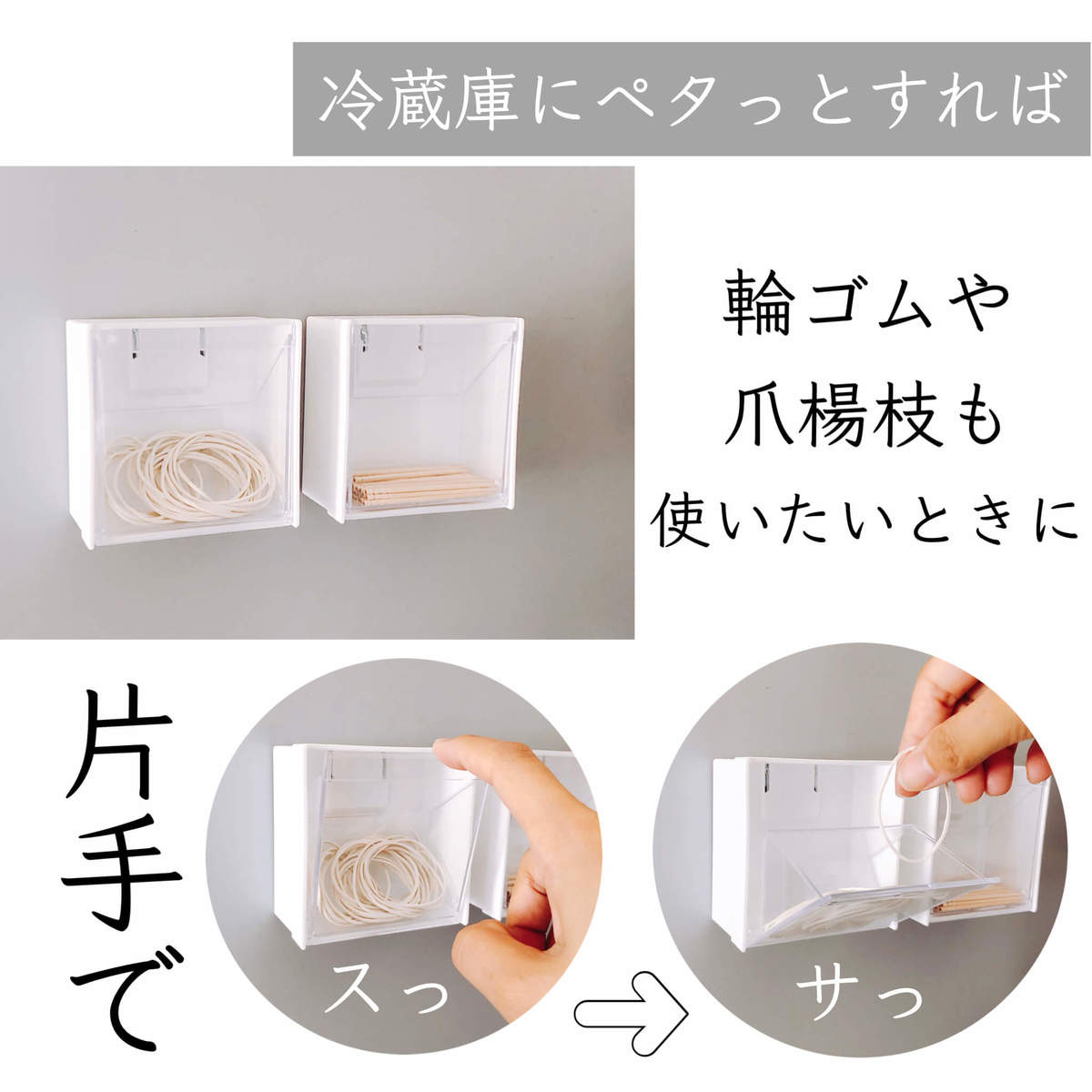 冷蔵庫にペタっとすれば、輪ゴムや爪楊枝など使いたいときにすぐに取れます。これは片手で簡単!