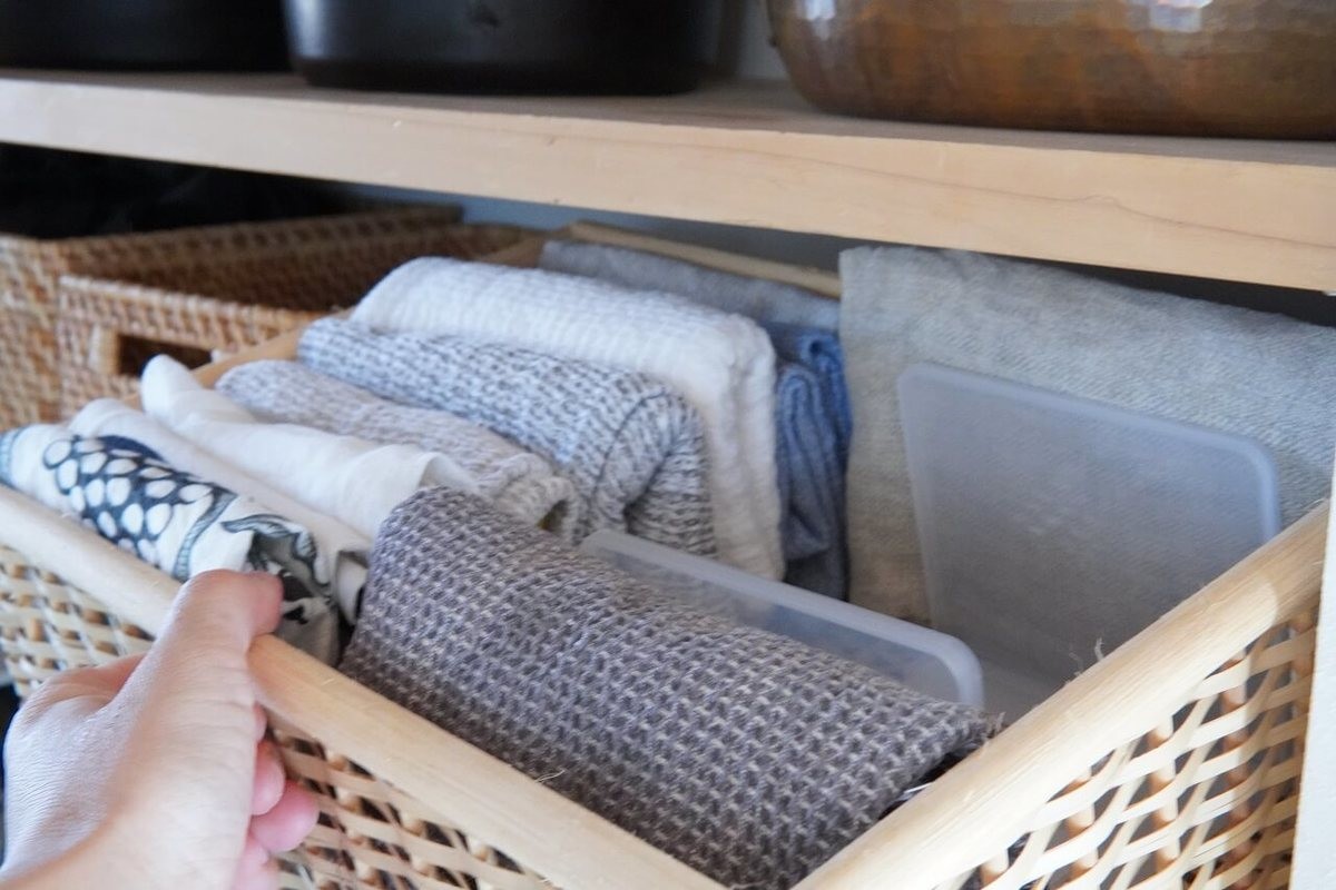 ワイドタイプの引き出し用仕切りで、使うとどうしても乱れてしまっていたキッチンタオルを分類ごとに分け、仕切って収納し直してみました。