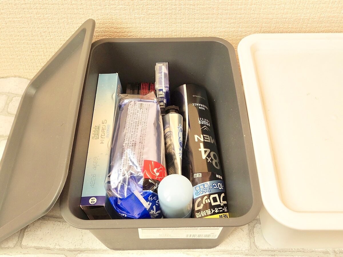 蓋つきでホコリがかぶりにくいので、ふだん使いしない洗面用具収納にぴったり。