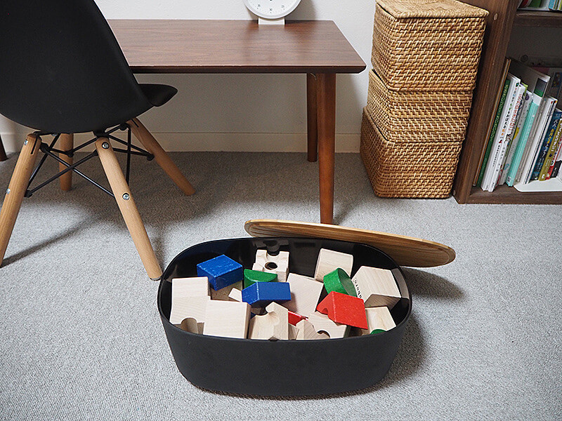 蓋をすれば中身が見えないので、カラフルな物が多い子どものおもちゃも気兼ねなく収納できます。