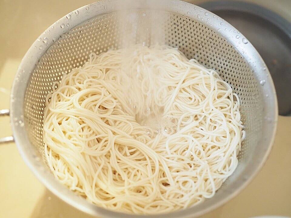 茹であがったら、ザルにあげて冷たい流水でほぐせば完成です。