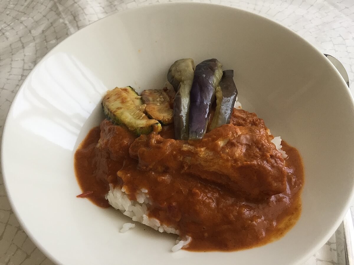 ですが、あえてナスとズッキーニの素揚げを添えて、夏野菜カレーにしてみました。これなら野菜も食べられるので、栄養バランスのよい食事になります。