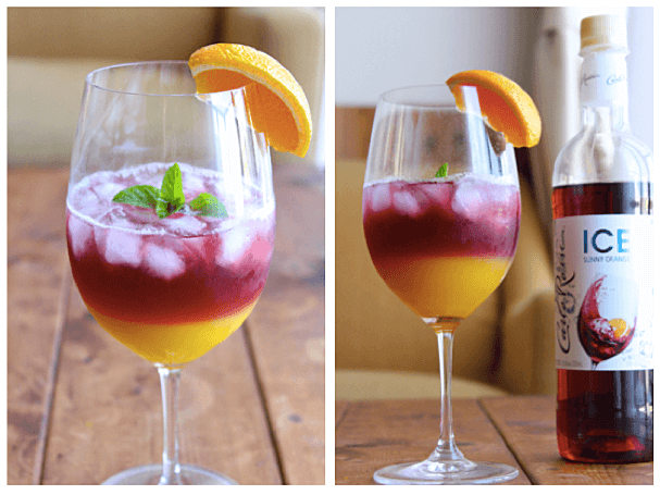 稲垣飛鳥さんがワイングラスに注いだこの2色のドリンクは、「カルロ ロッシICE」とオレンジジュース。