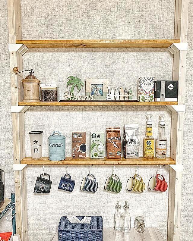 @taiki_h_officialさんは、ディアウォールで作った収納棚をダイニングテーブルの横に設置しています。毎日使用するコーヒーやマグカップをすぐ手に取ることのできる場所に置けるので、とても便利ですね!