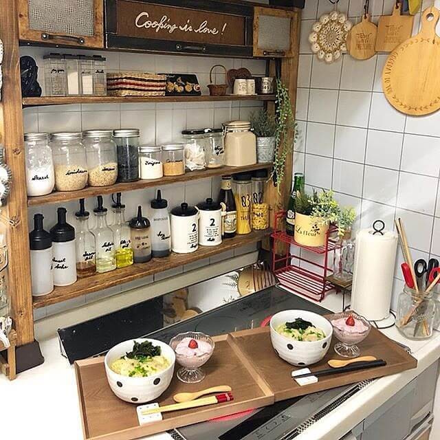 棚がおしゃれだといつもの料理も楽しくなりそうですね。棚全てに物を置くのではなく、スペースを残して置くことで、カフェのような雰囲気を演出することができます。