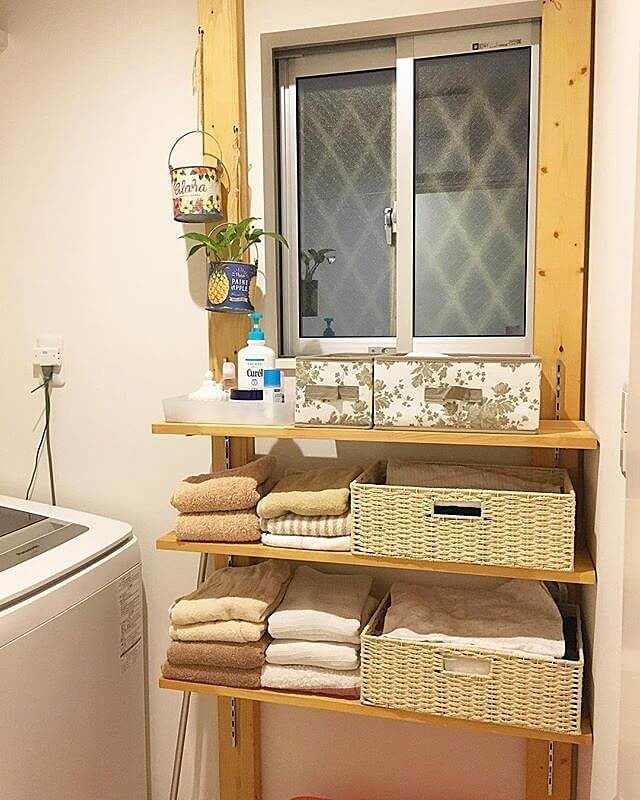 @j.house2016さんは、脱衣所にディアウォールを設置!子どもが自分でタオルや下着を取り出すことができるように、低めに棚を取り付けています。