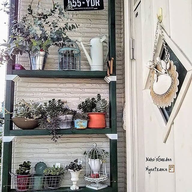 @na.tomatoさんは、ディアウォールを玄関横のディスプレイとして活用!ディアウォールなら、背の高い植物でも棚の位置を簡単に動かすことができるので、成長に合わせて高さを調節することができます。