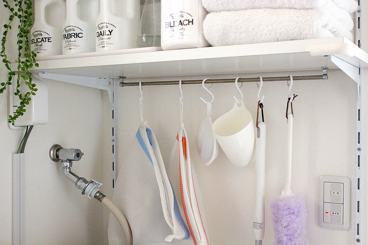 以前は、吊るしているモノを取った瞬間にS字フックまで外れて洗濯機の下に潜り込んで しまうなんてことがあり、小さなストレスになっていました。
