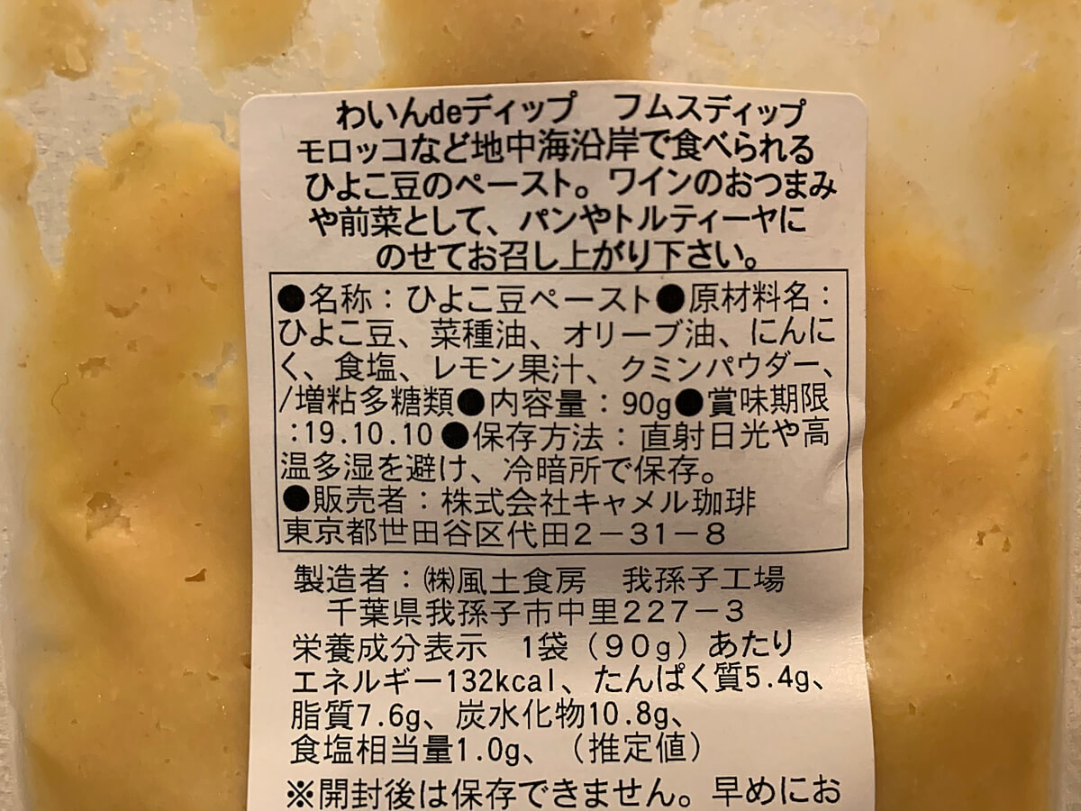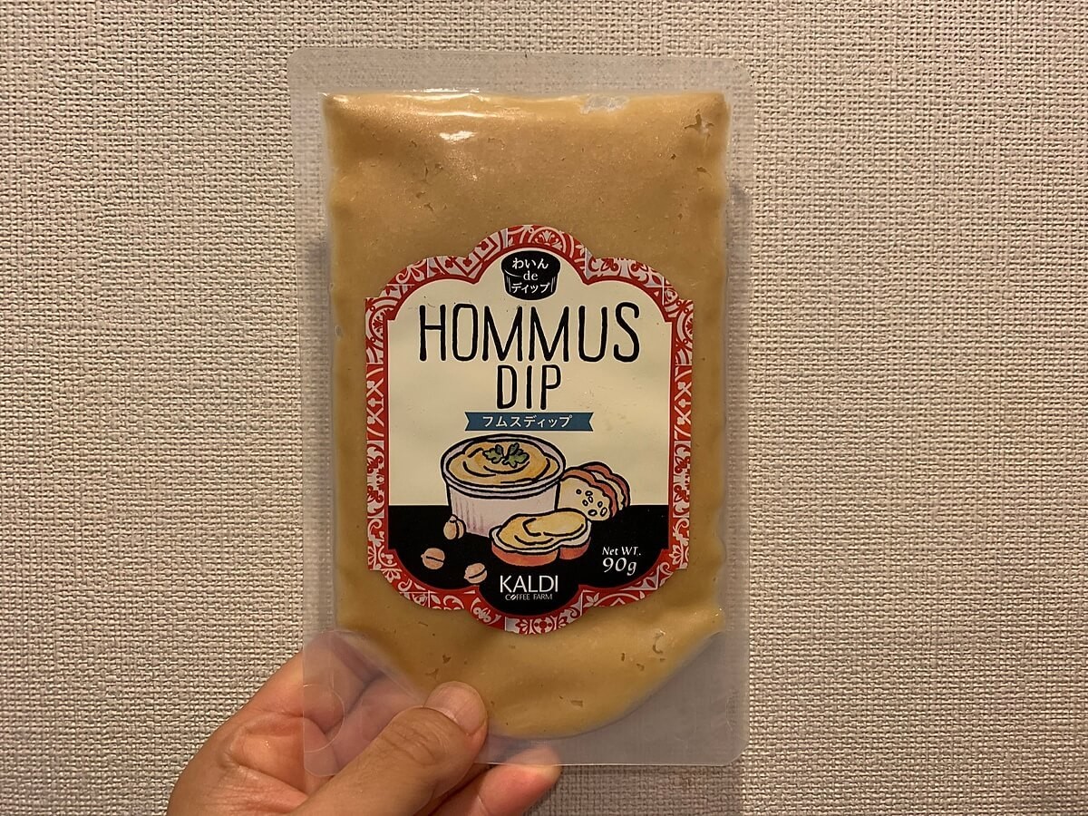 カルディの公式サイトには、『ひよこ豆をペーストにした中東の伝統料理「フムス」。ワインのおつまみや前菜として、パンやトルティーヤにのせてお召し上がりください。』とあります。