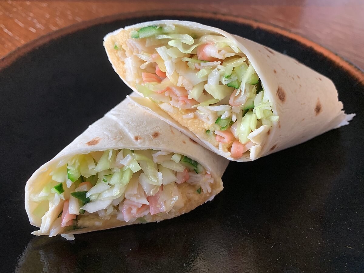 今回は冷蔵庫にキャベツとカニカマのサラダの作り置きがあったので、それを使ってみました。