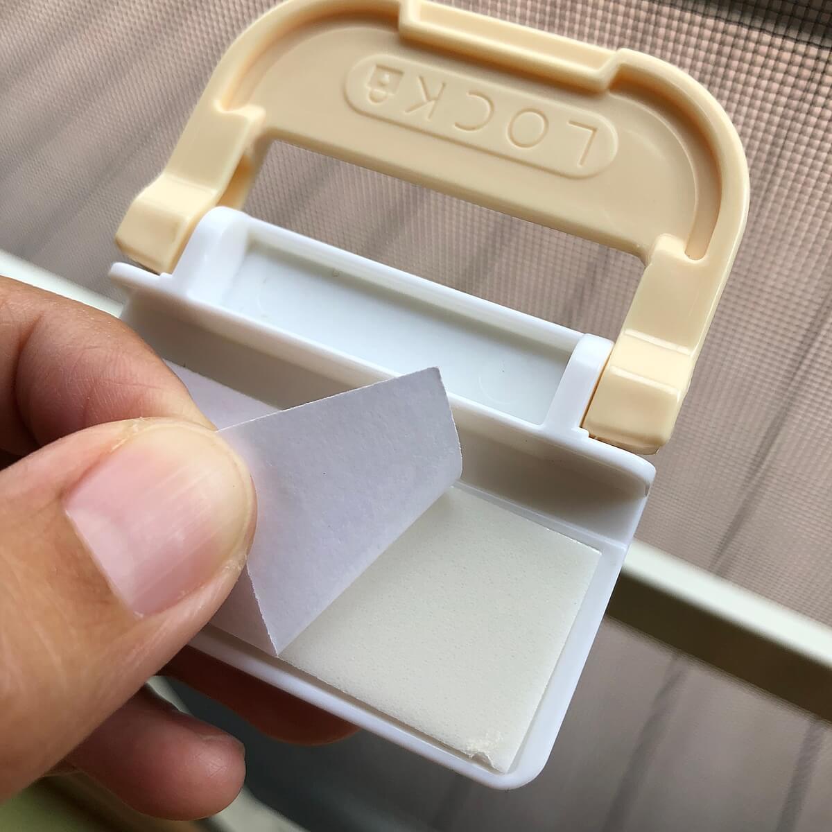「網戸用ロック」の裏面に粘着テープがあるので、窓を開けて網戸は締めた状態で、室内側の網戸の枠のサッシのきわあたりに、押付けて貼るだけ!