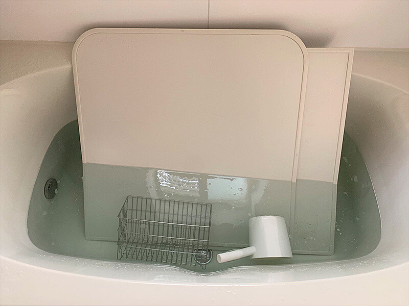 (2)洗面用具など、一緒にきれいにしたいものを投入。湯止めカバーも一緒に。