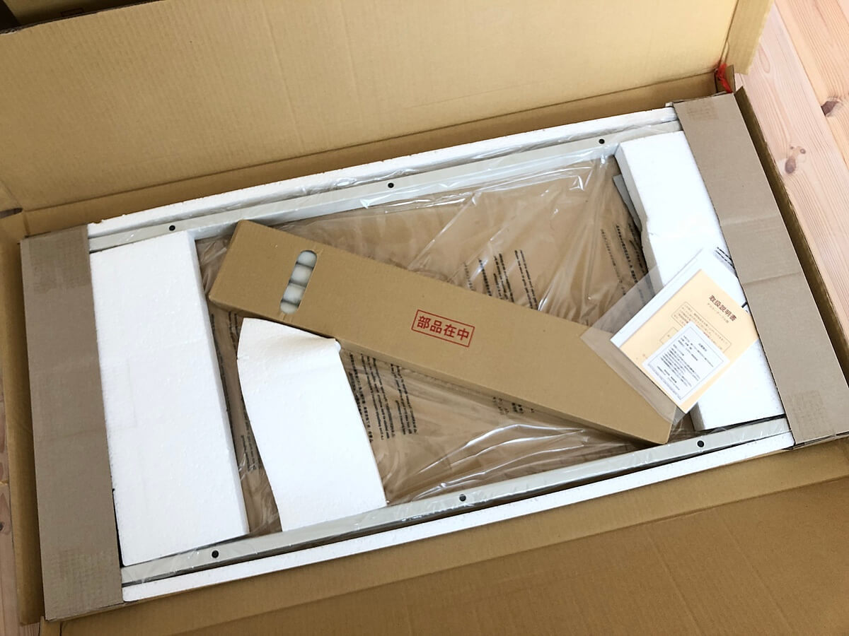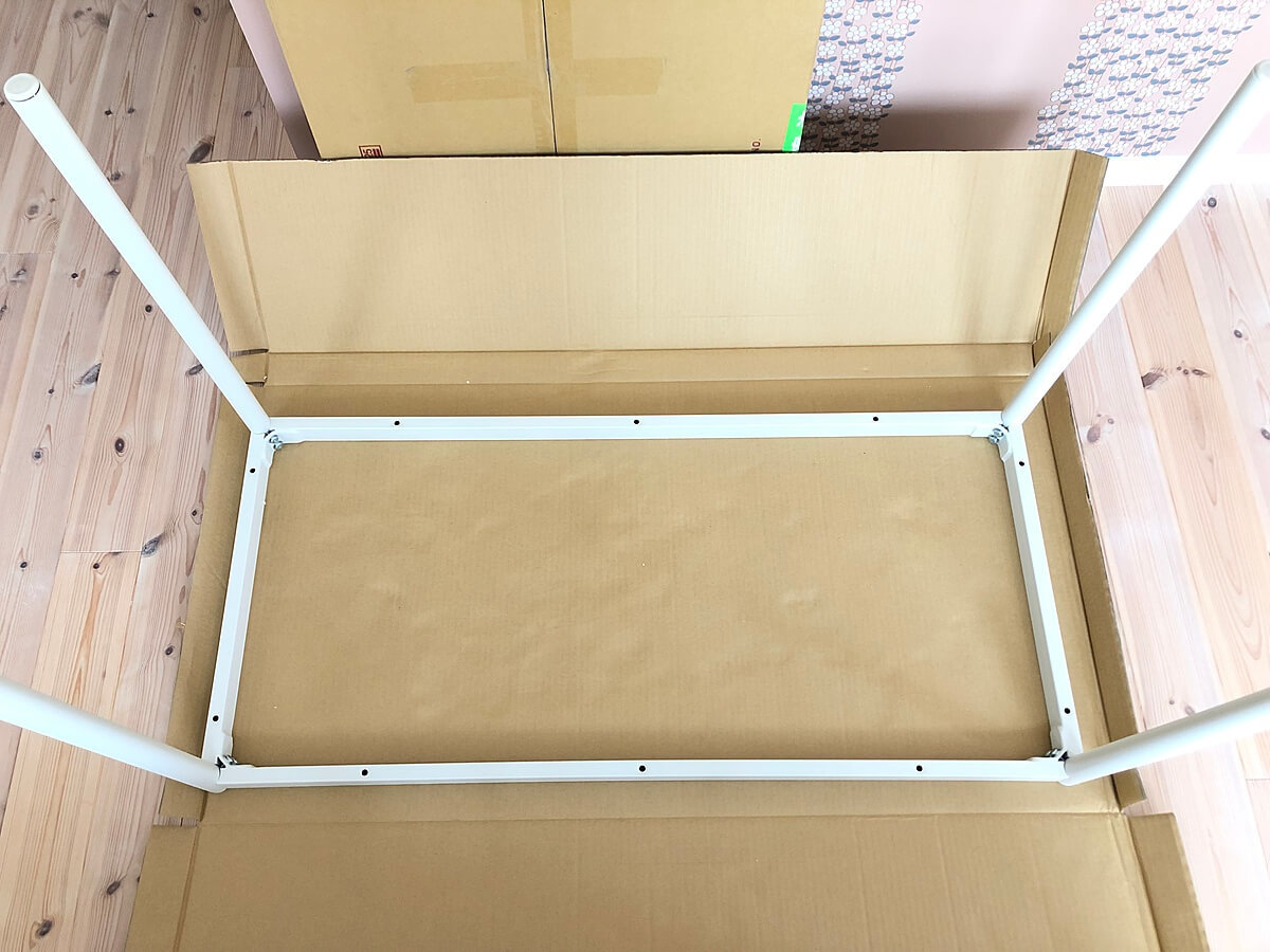 我が家では、ダンボールを開けて梱包材と脚を取り出し、そのダンボールの上で組み立てることに。