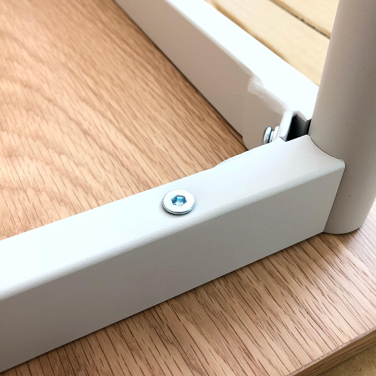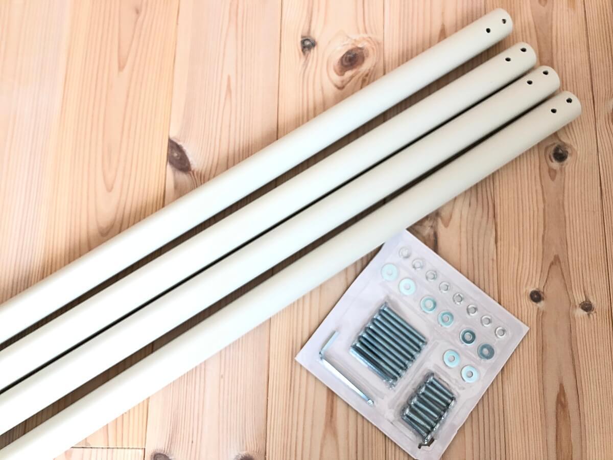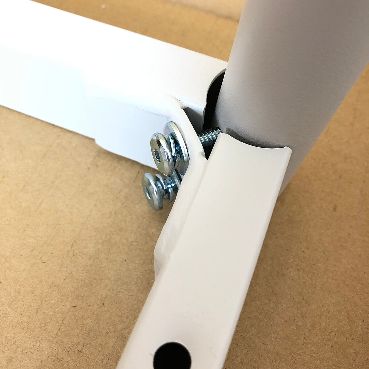 説明書の指示通りにボルト、スプリングワッシャー、ワッシャーを組み合わせて、フレームと脚を固定していきます。