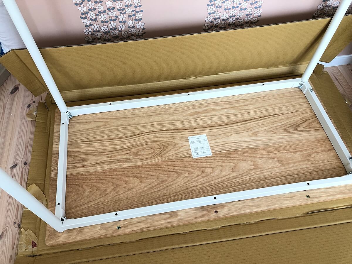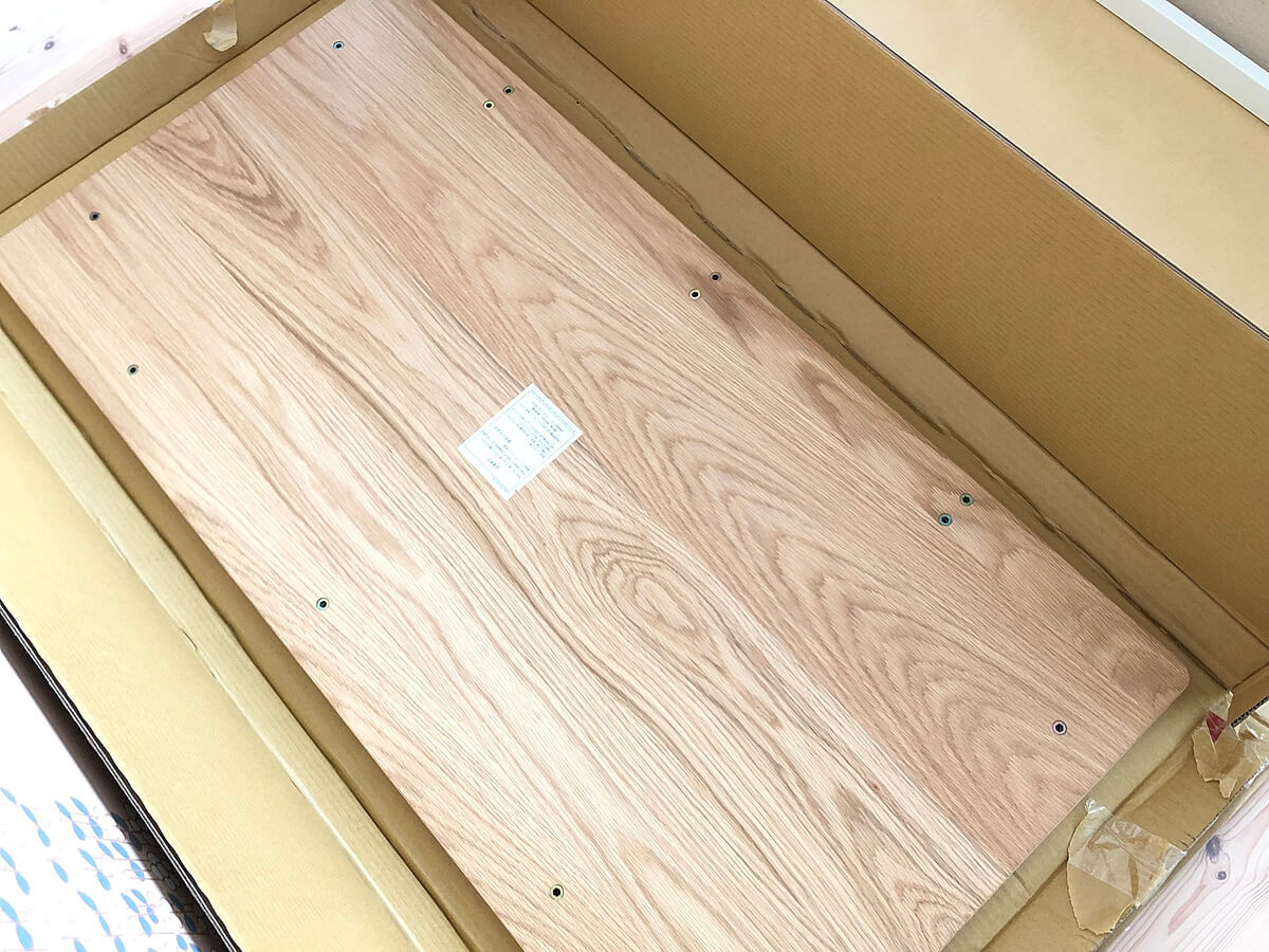 デスク天板のダンボールを開けると、天板があらかじめ裏面になっていたので、その場で作業を開始!