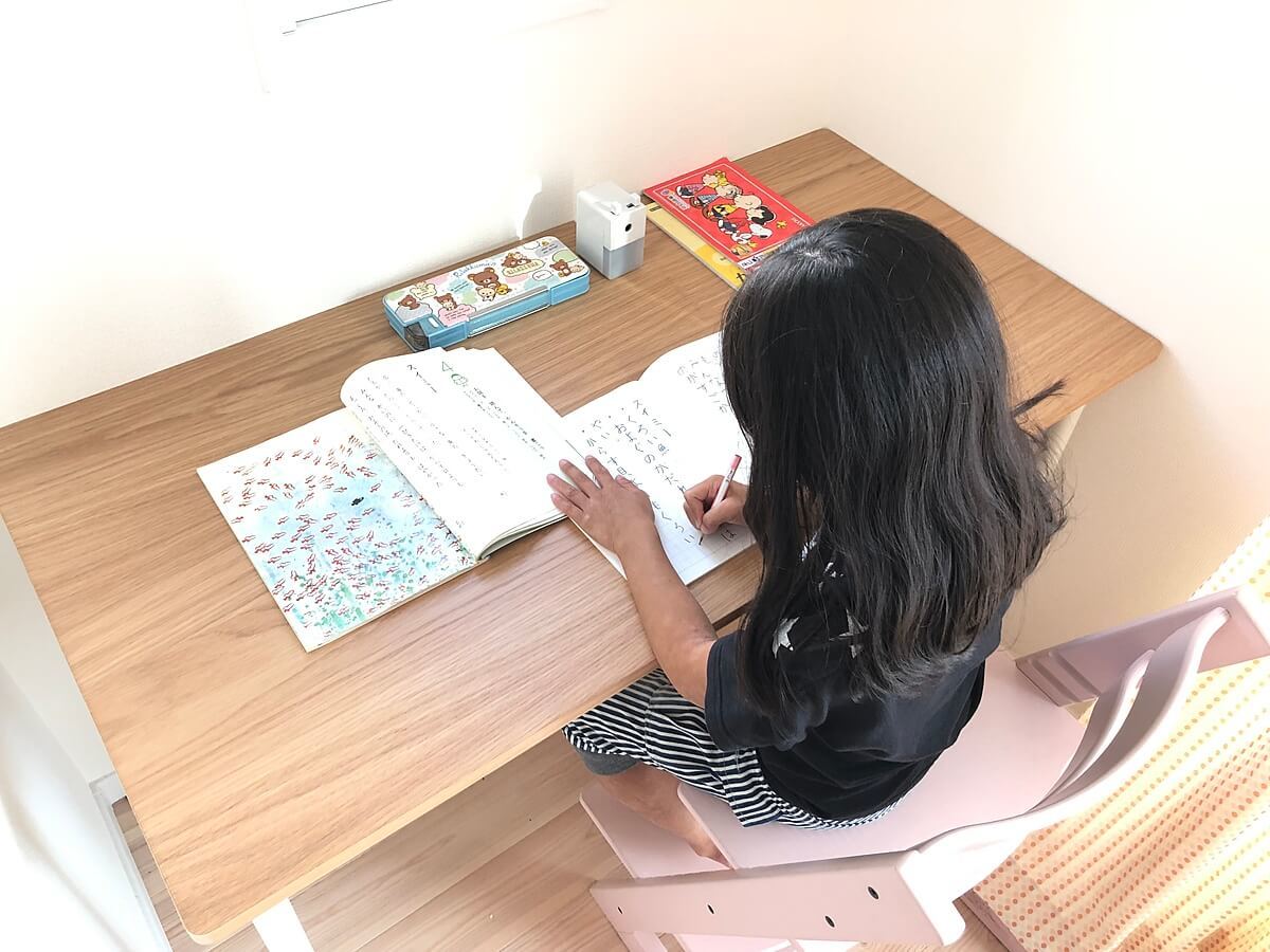教科書とノートを広げてもまだまだ余裕アリ! デスク椅子には「Stokke(ストッケ)」のハイチェアを使用しているので、高さも問題ナシです。