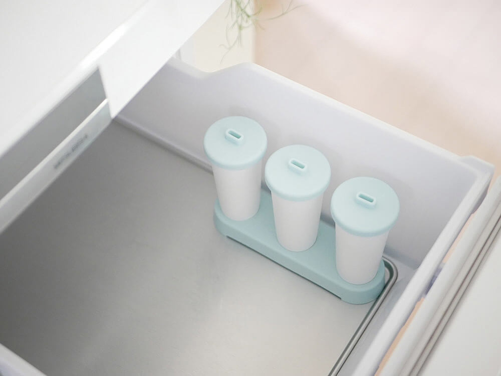 冷凍庫のすき間に立たせておけるデザインで、スタンドサイズは5×16cmとスリム設計が嬉しい。 ものがたくさん入った冷凍室でも邪魔にならずにしっかり自立して製氷出来ます。