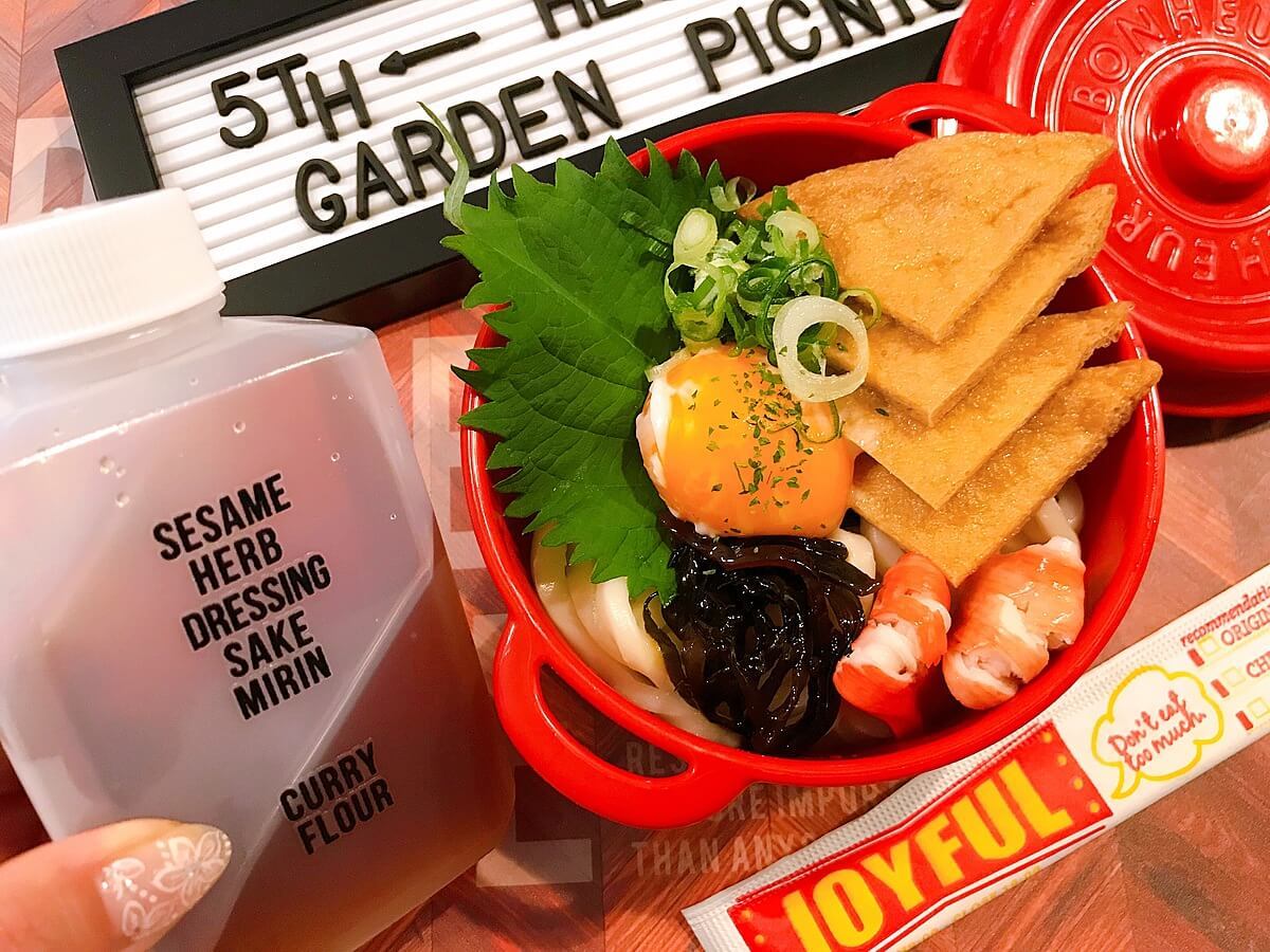 以前は、ドレッシングボトルに麺つゆを入れてましたが、液ダレが酷くて不評でした。