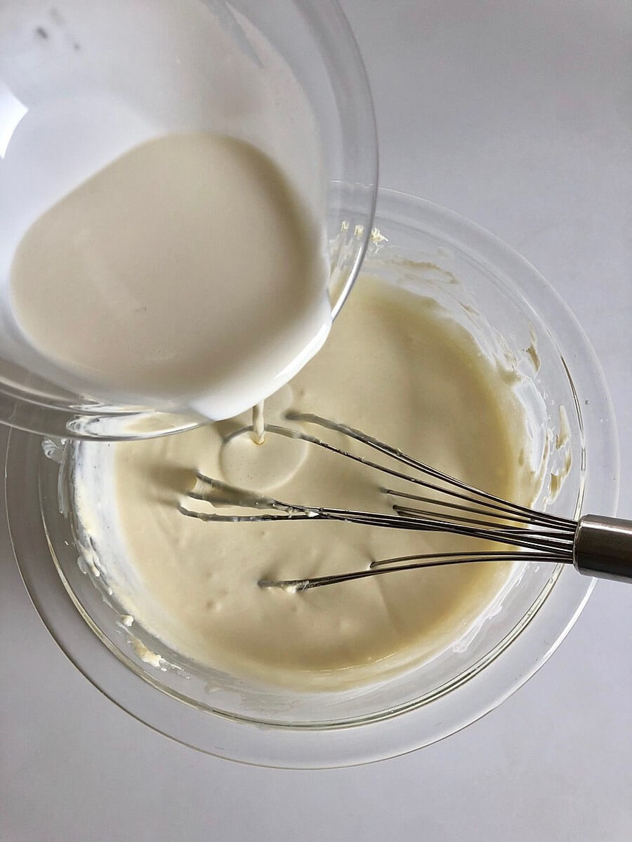 粗熱を取り、冷蔵庫で冷やしているレアチーズの上に流し入れ冷蔵庫で固める。