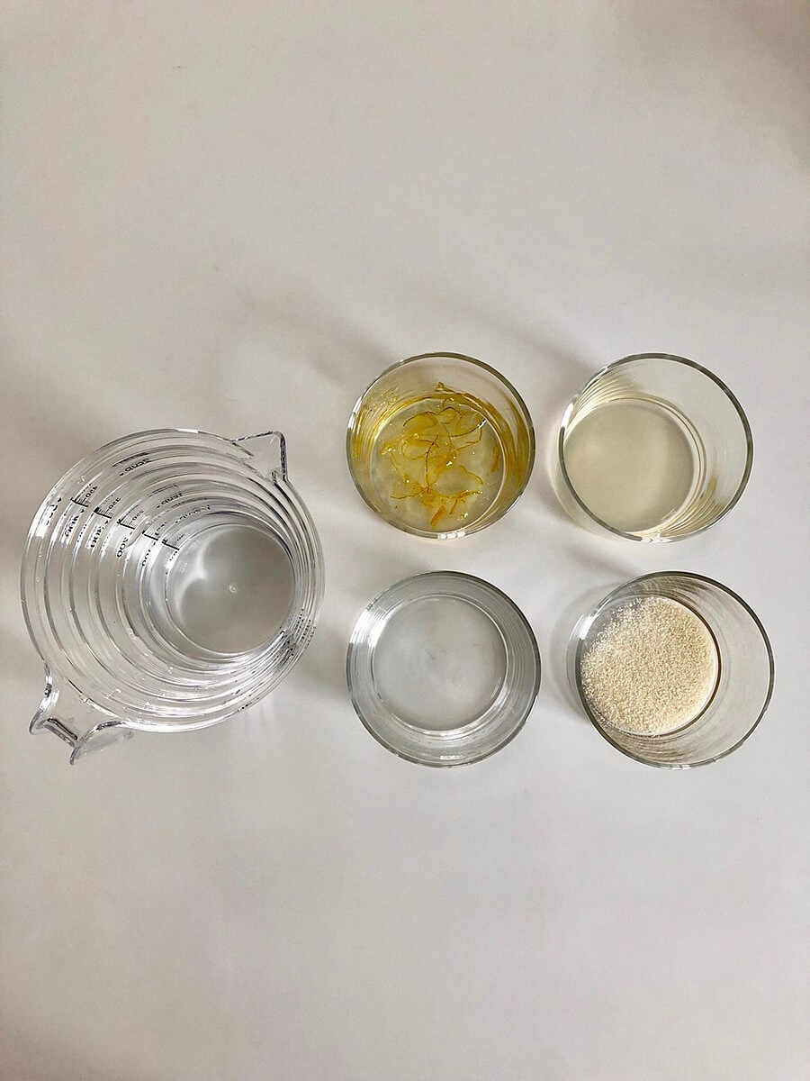 水(白ワイン)に粉ゼラチンを振り入れておく(入れ方が逆だとダマになります)