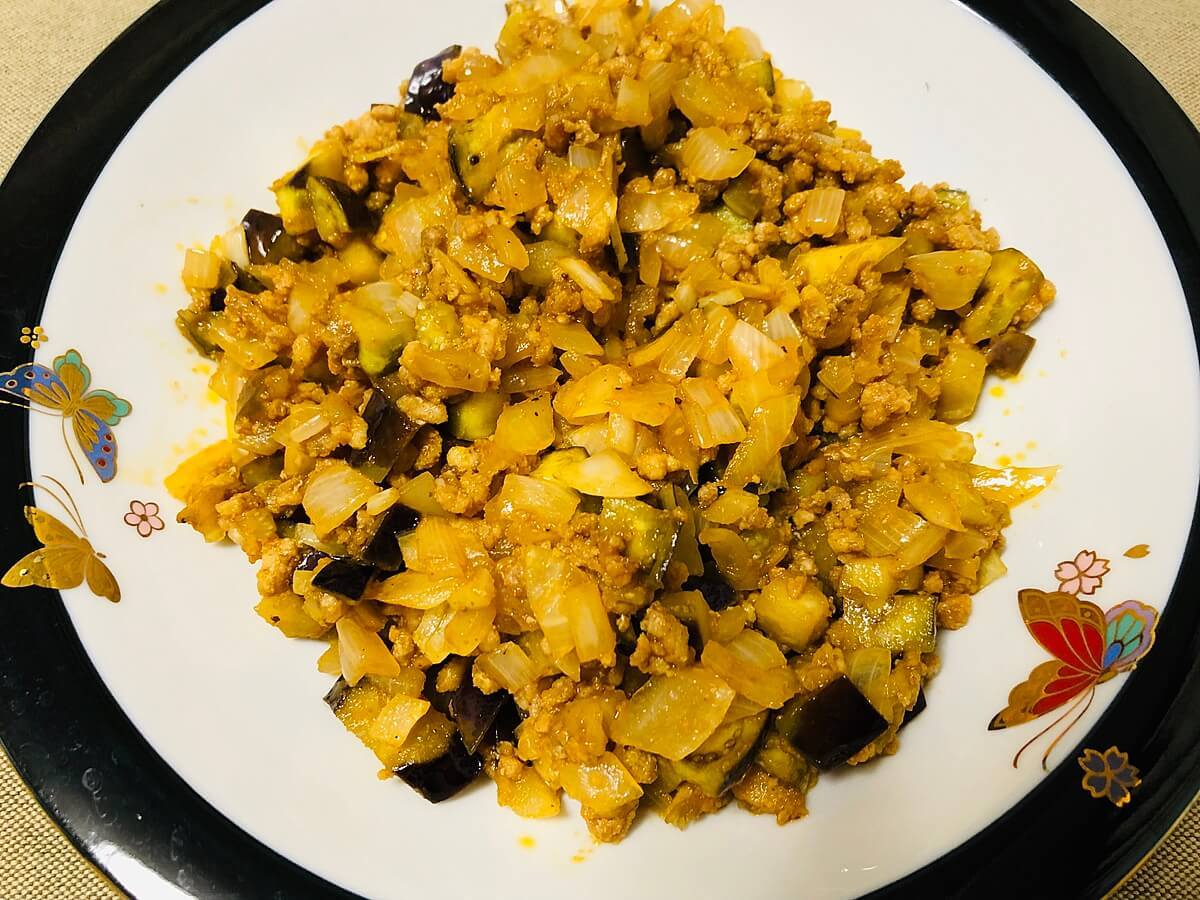 我が家では超簡単なミンチチャーハンも作りますが、色合いが微妙なこともあり、今回は超簡単な「ナスと豚肉のキーマカレー風」を作りました。