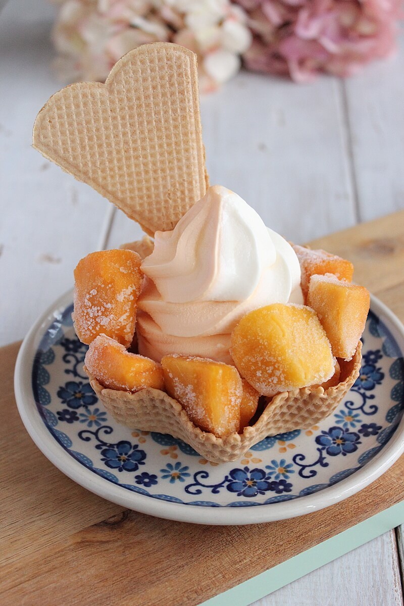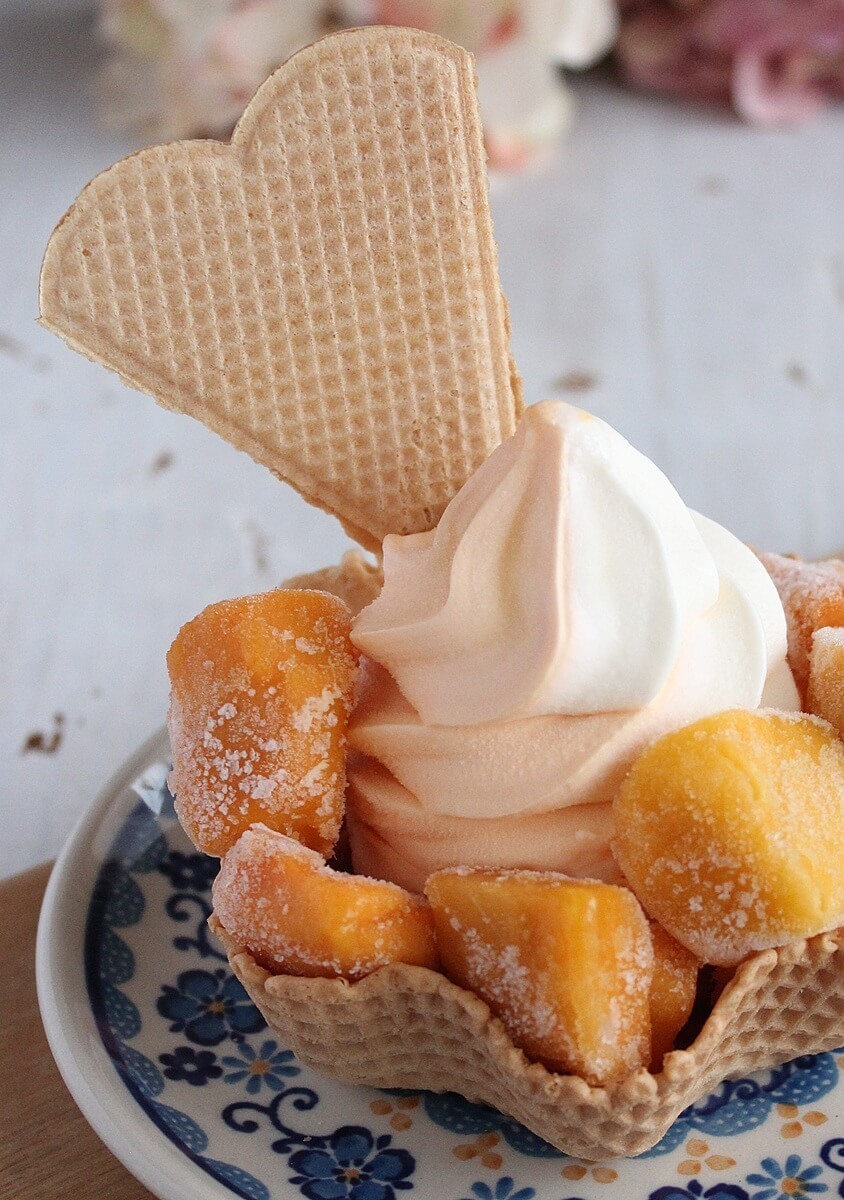 メロン&バニラ味が入ったソフトクリームに、たっぷりの冷凍マンゴーを添えて、ウェハースもトッピングしてみました。