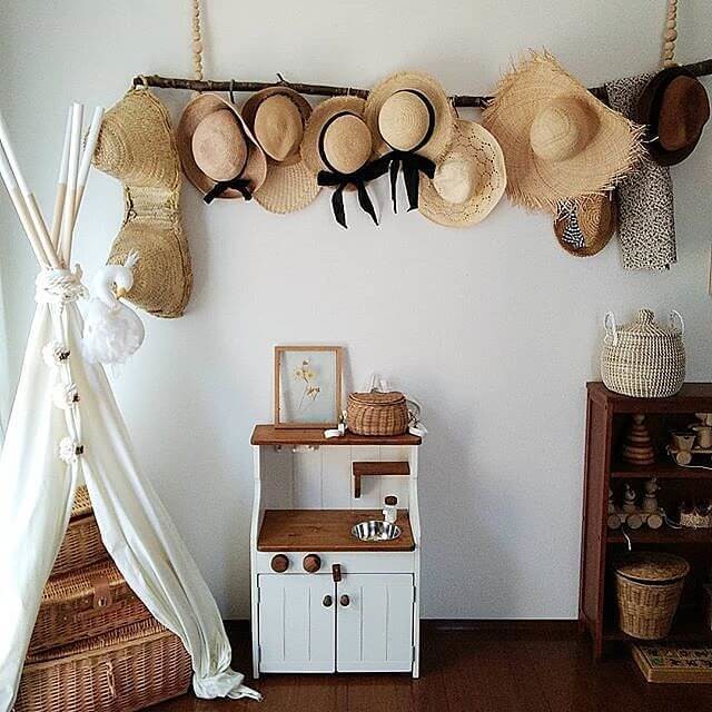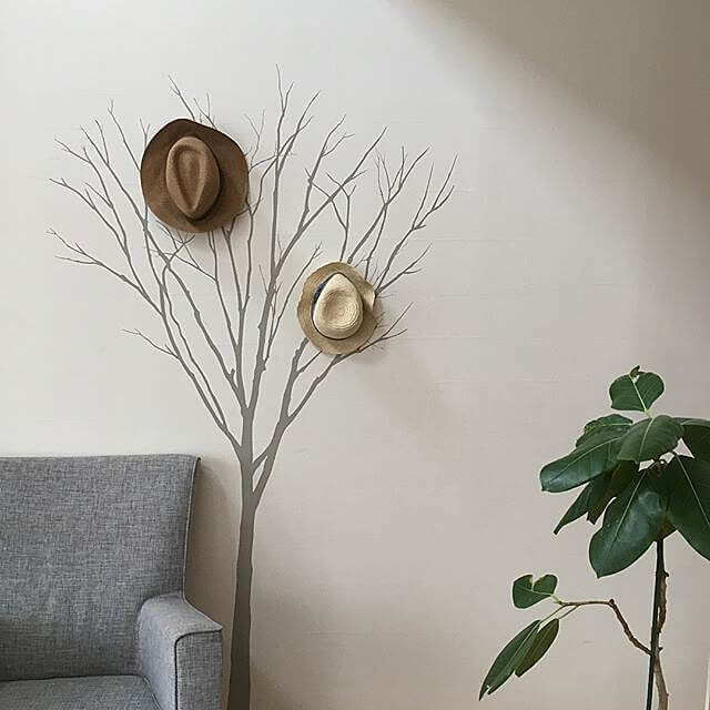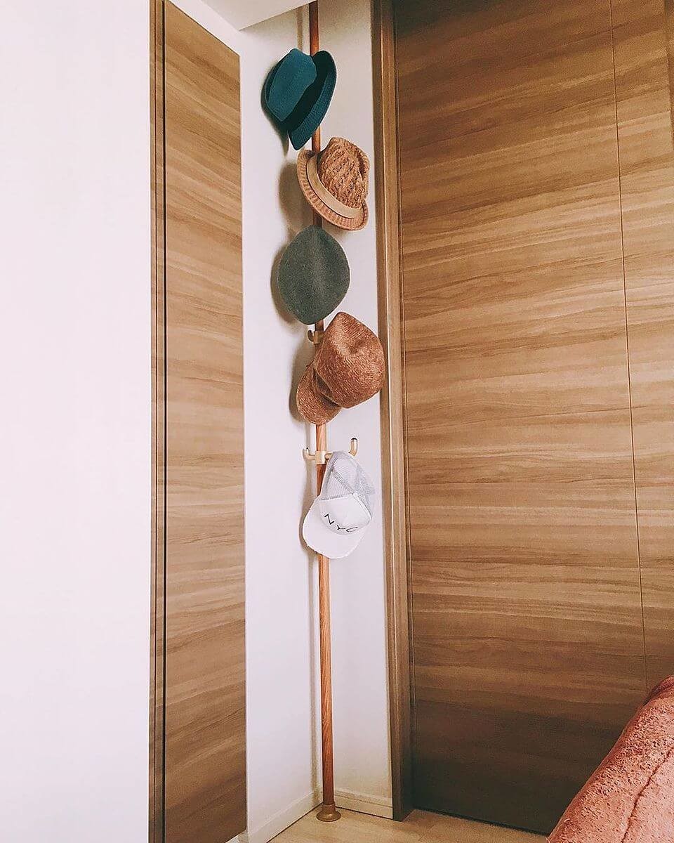 どうしても木の枝が手に入らない場合は、木目調の突っ張り棒で代用するのも良いかもしれません。ひとつひとつの帽子がインテリアとなり、まるでアート作品を思わせる素敵なアイデアですね。
