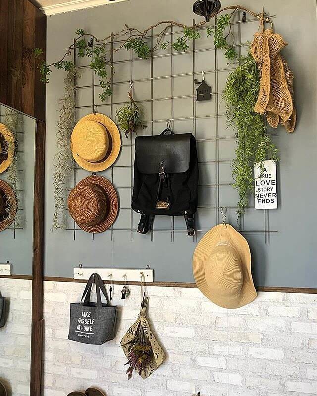 @mecchi555666さんは、壁面に大きなワイヤーメッシュを取り付けることで見せる収納を実現。帽子の収納はもちろんですが、バッグなどの小物も一緒に収納できるところも嬉しいポイントですね。
