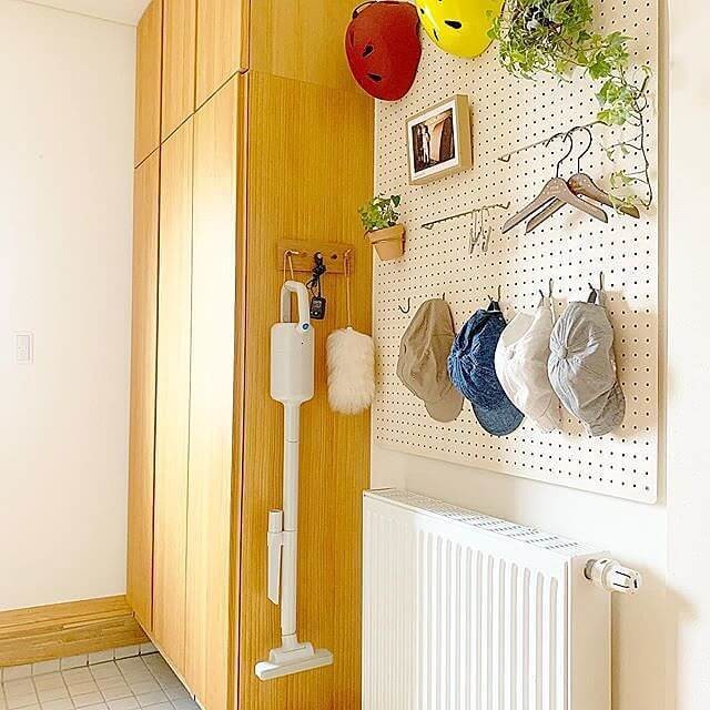 有孔ボードとは無数の穴があいている板のことで、壁を傷つけずに壁面収納ができる優れもの。もともと穴があいているためアレンジがしやすく、フックを使えば帽子の収納も簡単にできます。