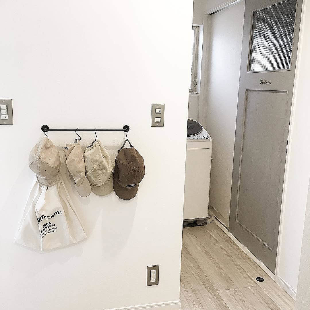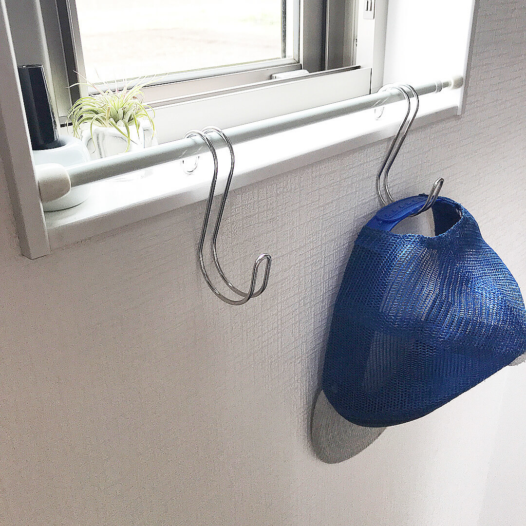@fur_ieさんはバーとS字フックを使い、玄関の壁面にお子さんの帽子を収納できるスペースを確保。