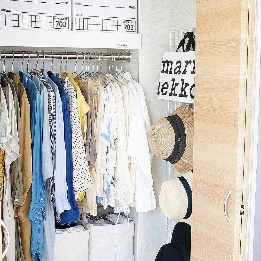 クローゼットで帽子を収納するときは、吊り下げ収納ラックを使うのも1つの手です。@________s.m.rさん宅のように、帽子を種類別にしまうと型崩れの心配がなく見た目もすっきりしますね。