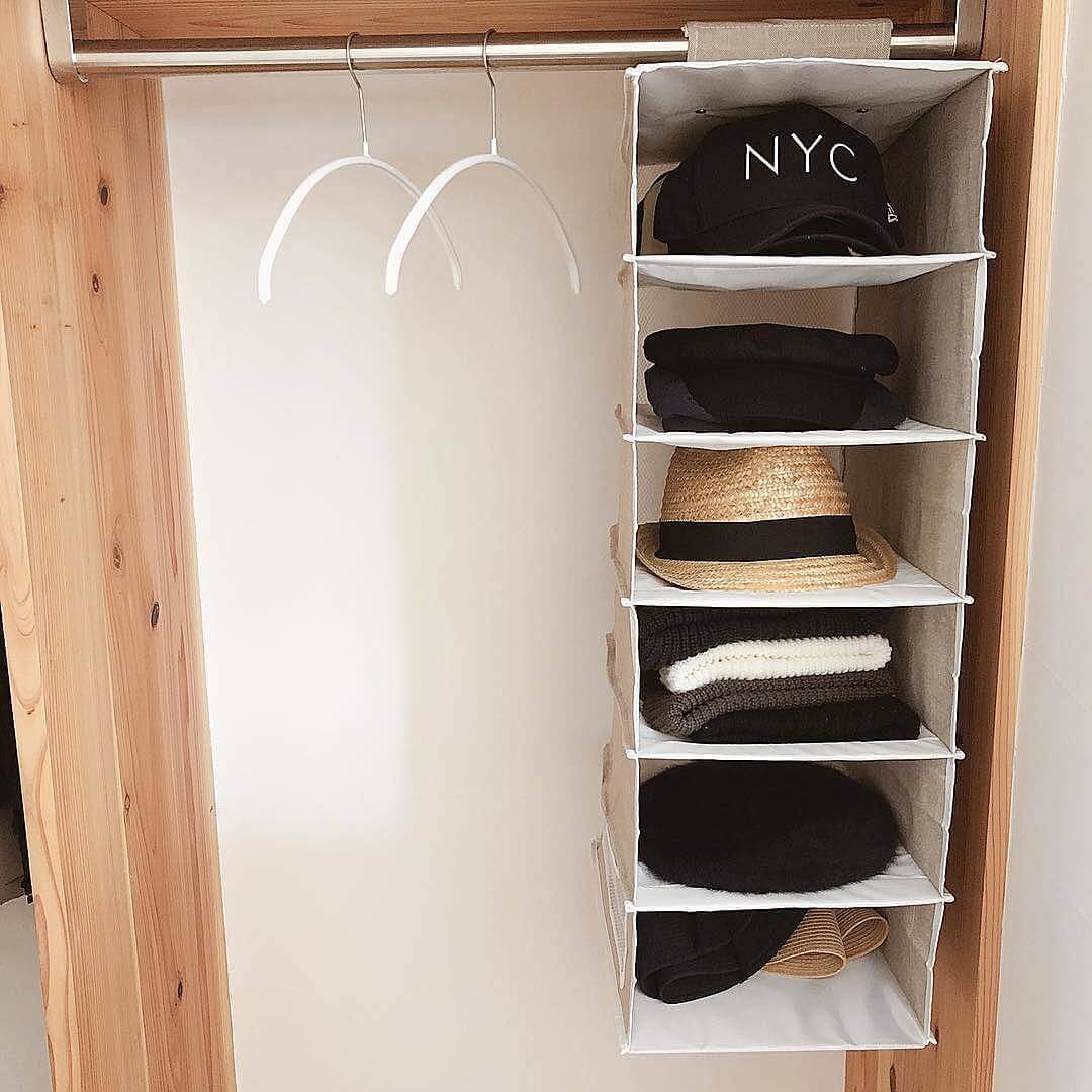 クローゼットに帽子を収納する際や、突っ張り棒を設置できる場所では、「吊るす収納」が便利です。