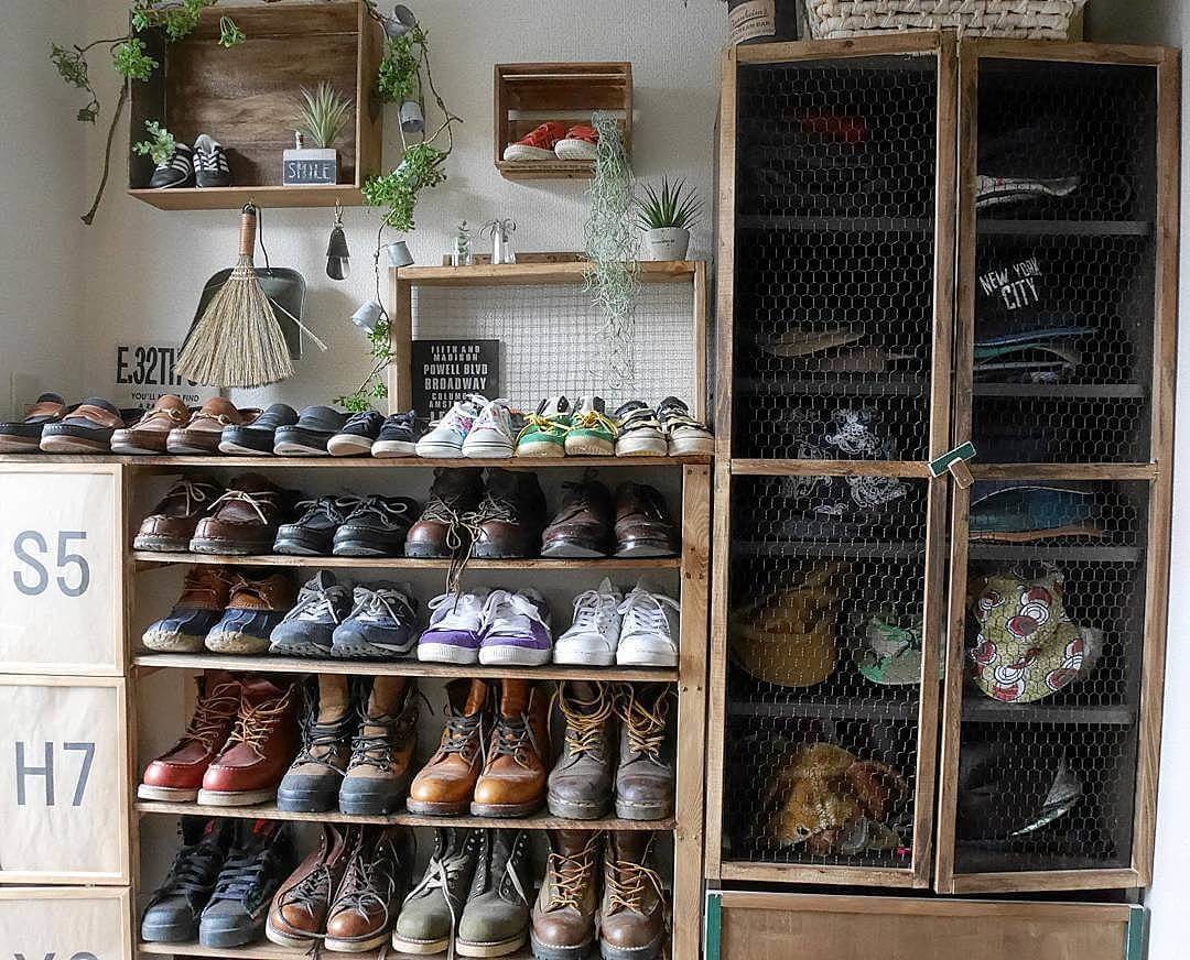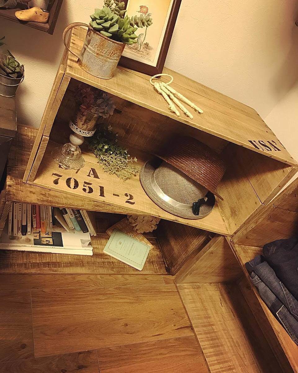 @moepinoowariさんの収納アイデアは、帽子がオブジェのようでとってもおしゃれですよね!こちらの棚はリンゴ箱をリメイクしたものだそうで、ステンシルでアレンジを加えるなどセンスの光る素敵な作品です。