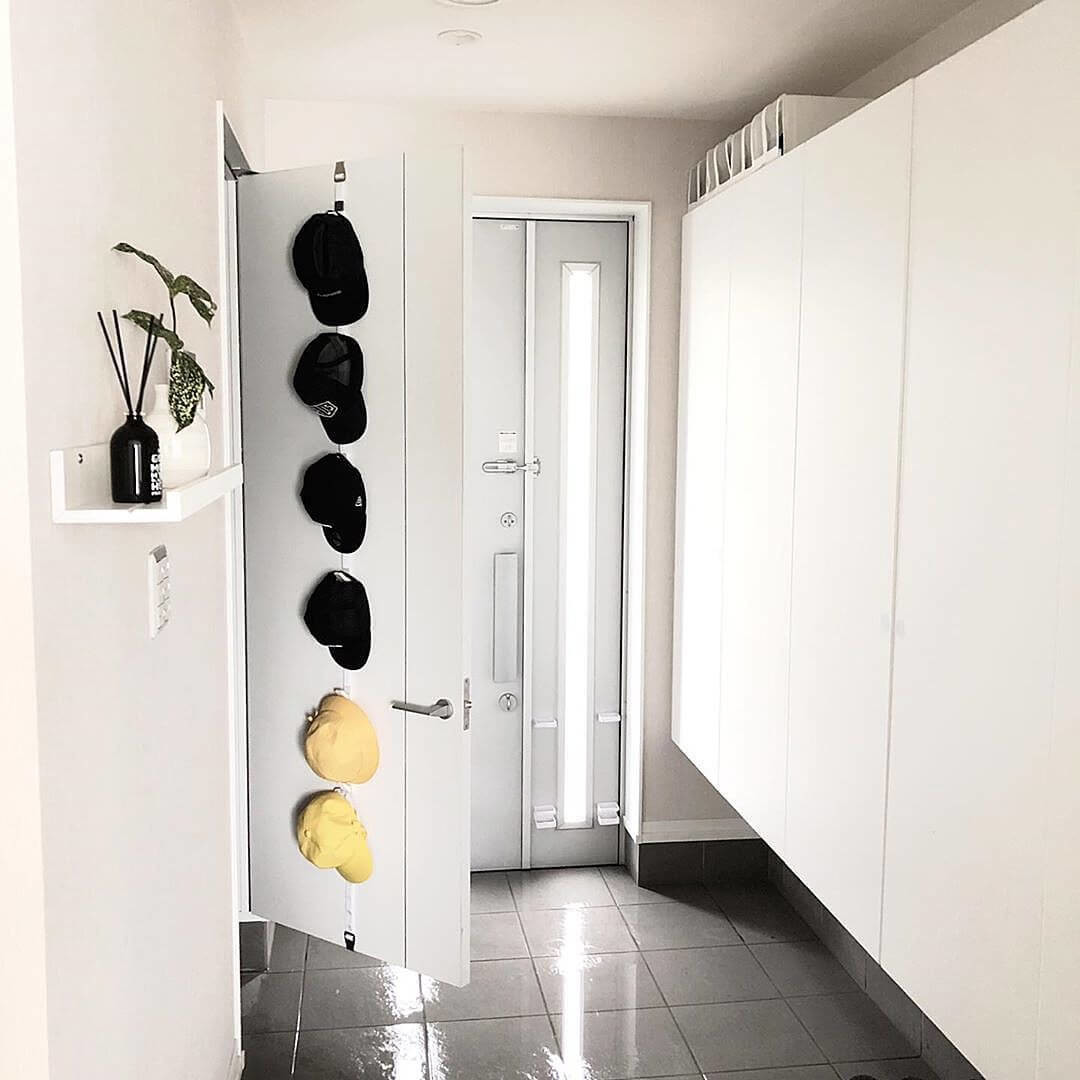 @meguri.kさんが帽子収納に使っているのは、縦に長いベルトタイプのドアフック。縦に収納することで場所をとらず、省スペースなのに帽子をたくさん収納できるところが魅力的です。