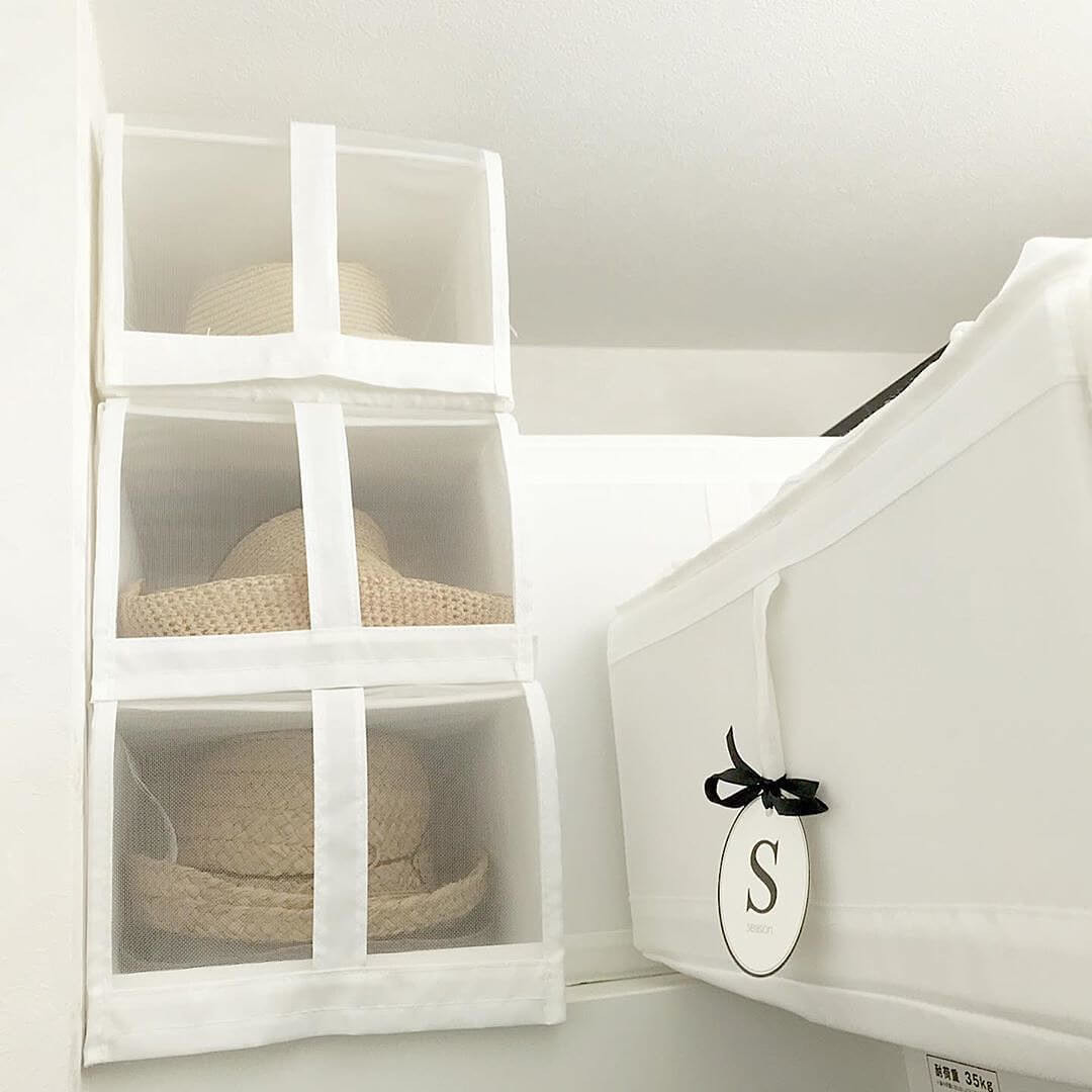 シーズンオフや使用頻度の低い帽子は、箱やカゴに収納しておくとクローゼット内がすっきりします。また箱にきちんと入れておくことで、ホコリや傷を防げるといった嬉しいメリットもあります。