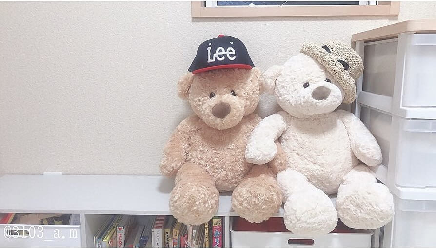 @3103_a.mさん宅では、クマのぬいぐるみがお子さんの帽子の収納場所になっているようです。使っていないときはぬいぐるみの帽子に早変わりするという、とっても可愛らしいアイデアですね。