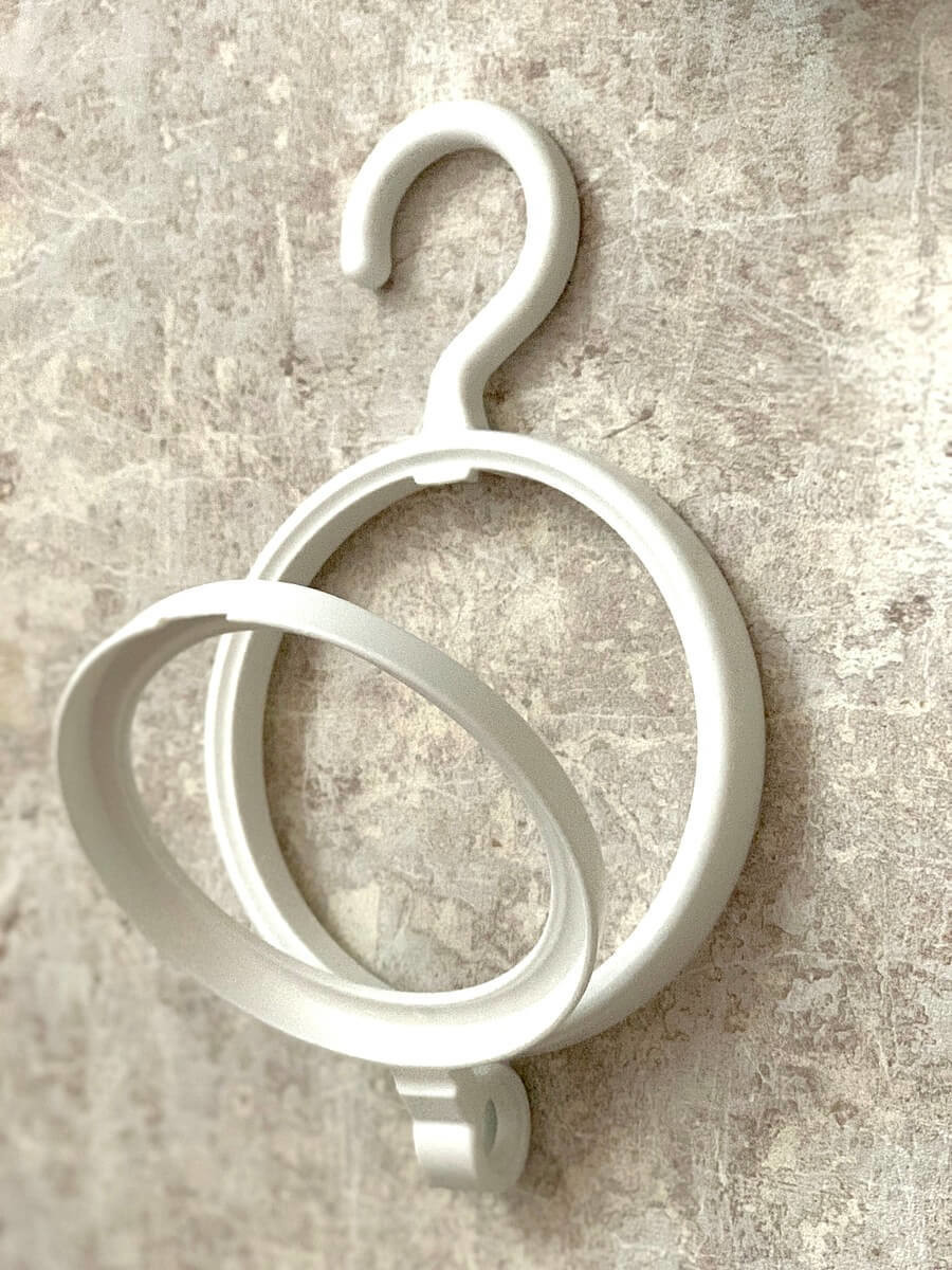 リングの下に、もう一つ小さいリングがついているので帽子ハンガーを2つ連結して、それぞれに帽子をかけても問題なし。 単品で使用する際は耐荷重160g、連結する場合は総耐荷重1kgです。