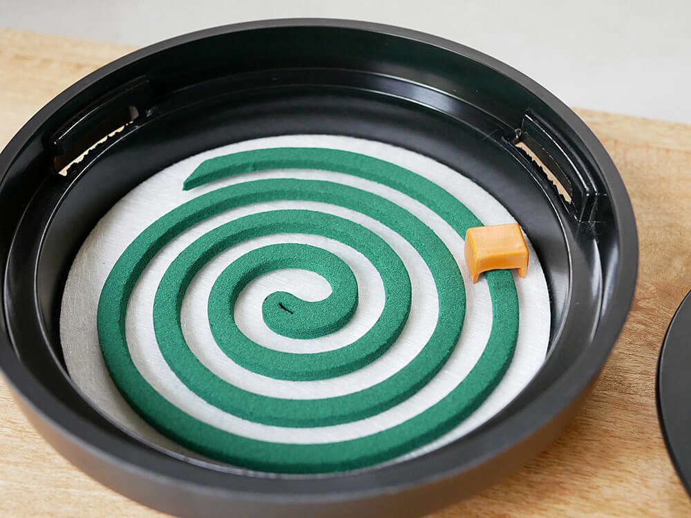 付属の不燃ガラスファイバーシートを敷き、その上に蚊取り線香を置いて使用します。 一般的な蚊取り線香(直径12cmまで)に使用できます。