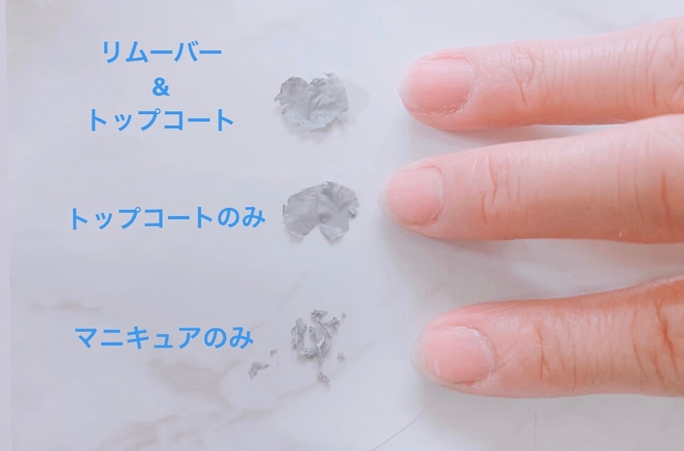 全部剥がせましたが、やはりトップコートがある方がペリッと気持ちよく剥ぐことが出来ました。