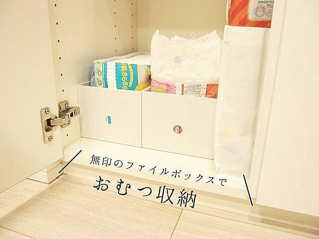 @nimr___homeさんは、無印良品のファイルボックスをおむつ収納に活用しています。おむつの取り出しやすさを重視して、あえておむつがはみ出る高さのものを選んだそうです。