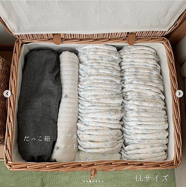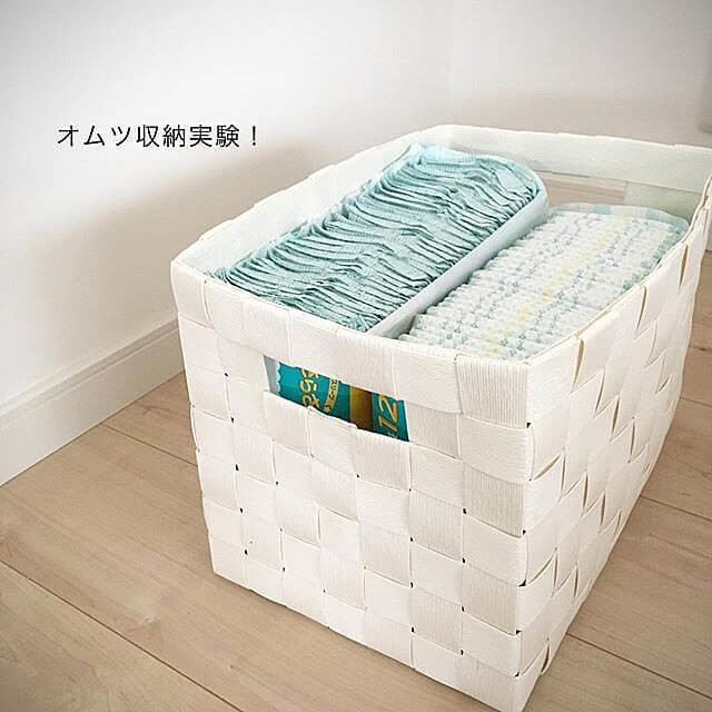 @yu_______m215さんは、ナチュラルな風合いが素敵なフタ付きのかごをおむつ収納に使っています。見た目以外にサイズ感にもこだわっており、あえておむつがたくさん入る大ぶりなかごを選んだそうです。