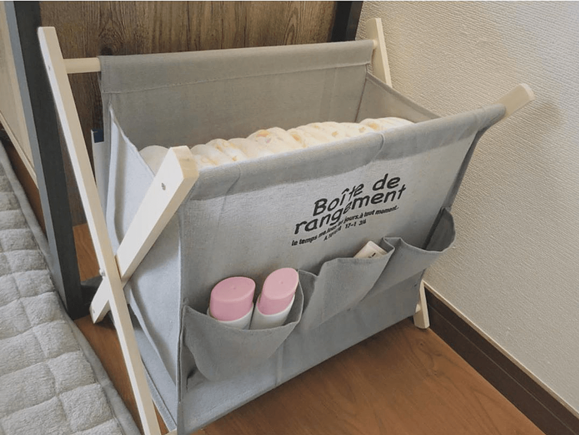 @_szbaby_さんは、ニトリの布製バスケットをおむつ収納に活用しています。おむつ卒業後には、おもちゃの収納ケースとしても使えることが購入の決め手になったんだとか。