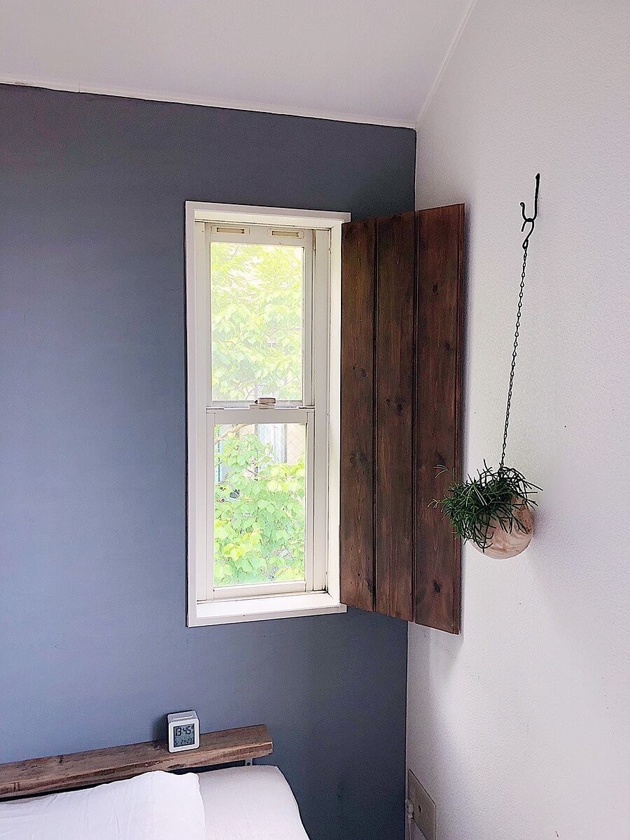 壁をグレーにしたことで、外のグリーンが映えて窓を開けると飛び込んでくる植物や光が楽しみになりました。漆喰は調湿効果や消臭効果もあるので、寝室にもぴったりです。