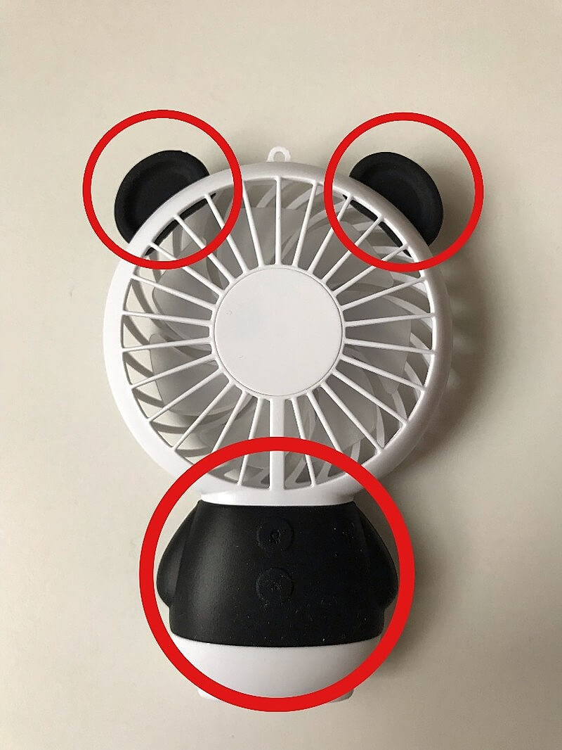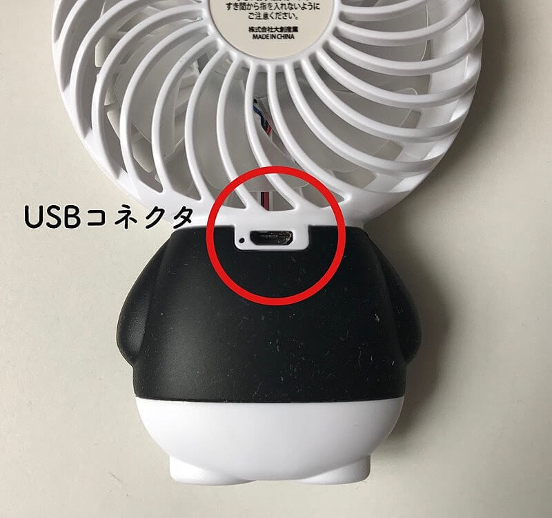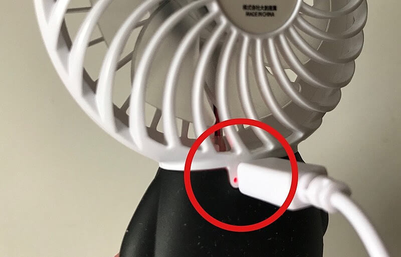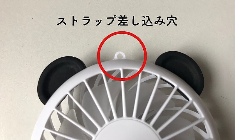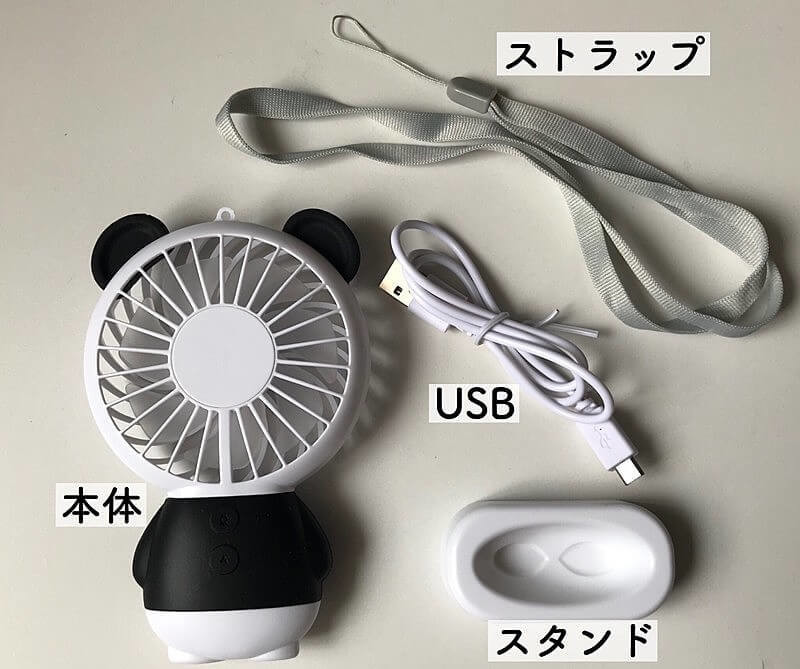 扇風機本体にストラップ、USB充電ケーブル、スタンドがついています。ガードの隙間から指を入れないようにご注意してくださいね!