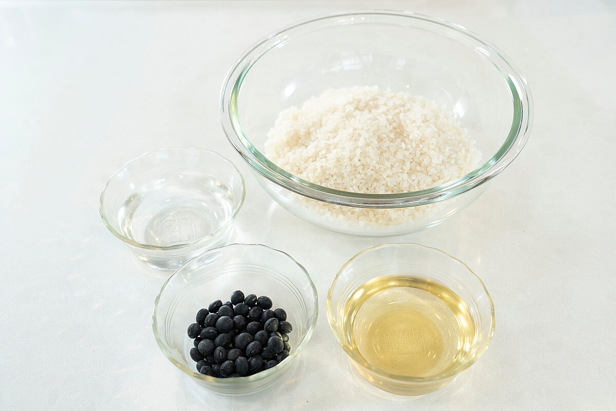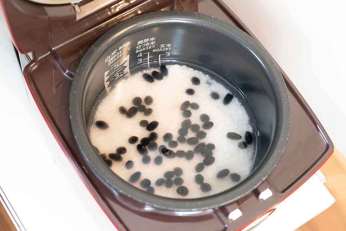 お米を洗い、炊飯器に黒豆を汁ごと入れ、3合の目盛りまで水を加えてお米を炊きます。