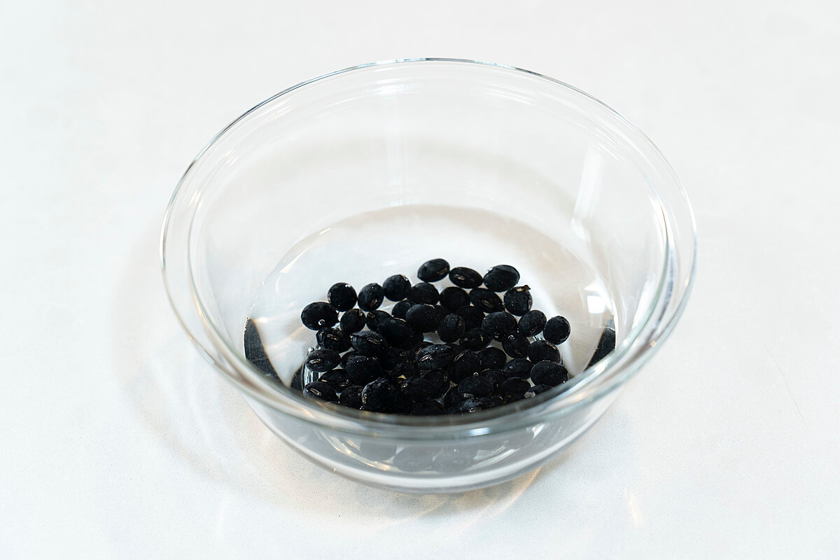 黒豆と水100mlを耐熱皿に入れ、ラップをかけて600Wの電子レンジで3分あたためます。
