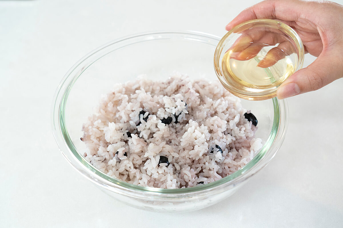片方のごはんにすし酢をまわしかけて、手早く混ぜ合わせます。