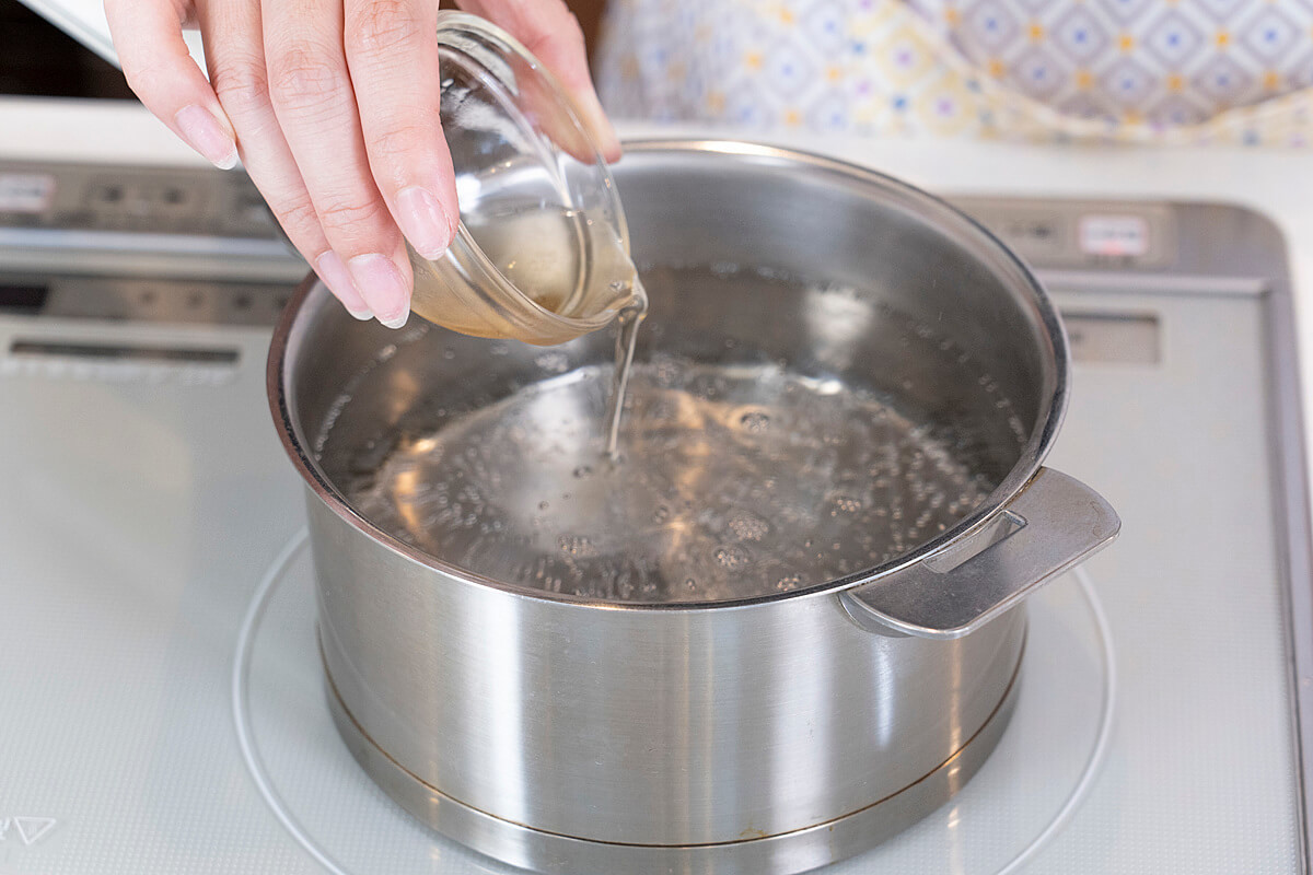 次に、鍋に、もう半量の水を入れ、今度はりんご酢を加えて沸騰させます。