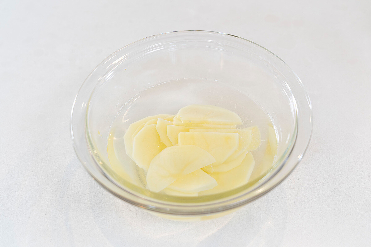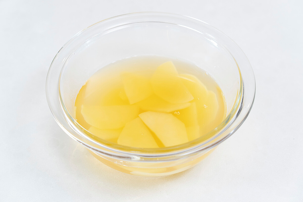 空気と触れることによる変色を防ぐため、ボウルに入れた水にさらし、10分以上おきます。