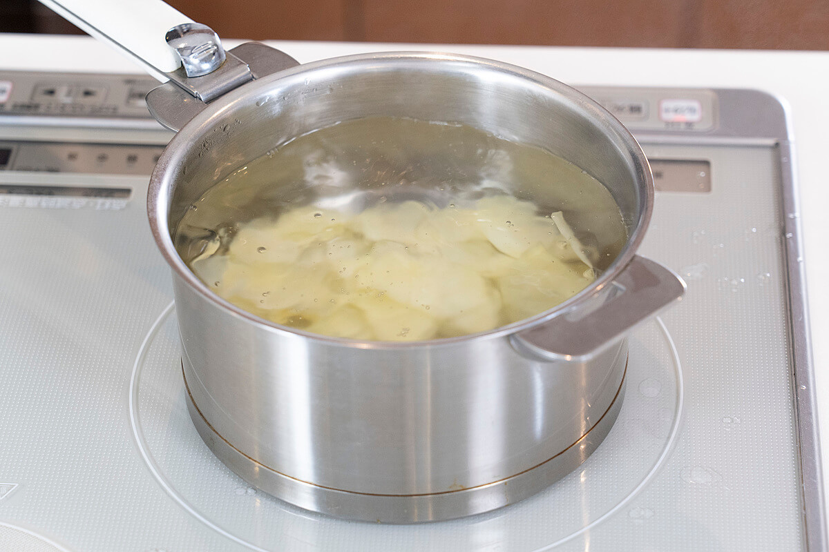 ※お湯を沸騰させるときには、やけどしないよう十分に注意してくださいね。沸騰したお湯に、半量のじゃがいもを入れて2分煮ます。